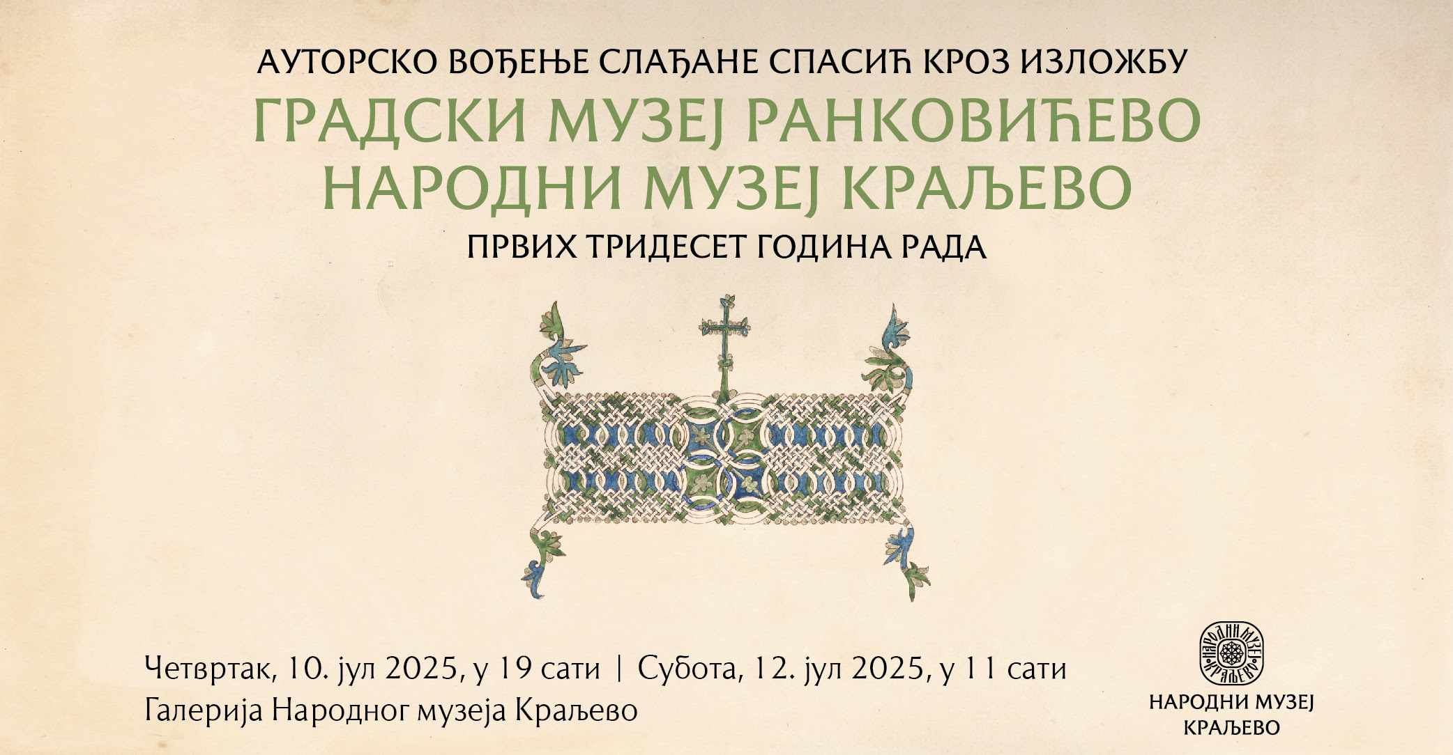 Autorsko vođenje kroz izložbu „Gradski muzej Rankovićevo – Narodni muzej Kraljevo: Prvih trideset godina rada (povodom 75 godina od osnivanja)” uvodi nas u pionirske dane Narodnog muzeja u Kraljevu. Vođenje će održati viši kustos Slađana Spasić u četvrtak, 10. jula 2025. godine, u 19 časova i u subotu, 12. jula, u 11 časova.
